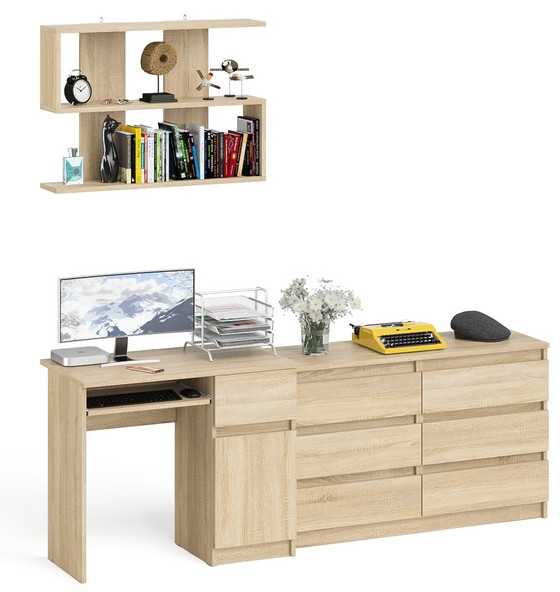Широкий комод Мори МК1200.6 с письменным однотумбовым столом МС-1 правый и полкой на 900. Цвет - дуб сонома. Габариты (ШхГхВ) 210,4х50х209,6 см. Не универсальная сборка. Тумба стола справа имеет нишу с полкой за дверкой и ящик на роликовых направляющих. Комод оборудован 6 выдвижными ящиками, расположеными по три в два ряда. 3 полки с боковыми стенками по диагонали соединеных 2 задними панелями.
